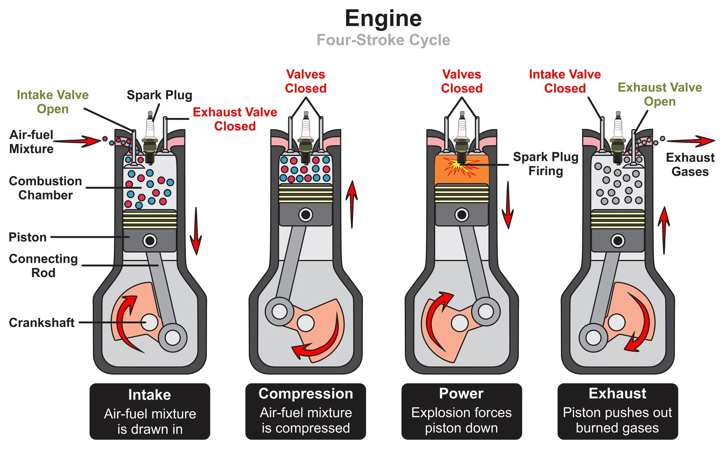 To paint a better picture in your head, the internal combustion engine starts with the camshaft opening the intake valve, allowing air and fuel commanded by the ECM to the combustion chamber. All valves then close for the piston to compress the air-fuel mixture. Once the piston reaches the top, the ECM commands spark for combustion to occur pushing that piston down, creating power. Finally, the camshaft opens the exhaust valves and the pistons come back up to let the gases out of the exhaust manifold. With all of this in sync, this is how combustion occurs.